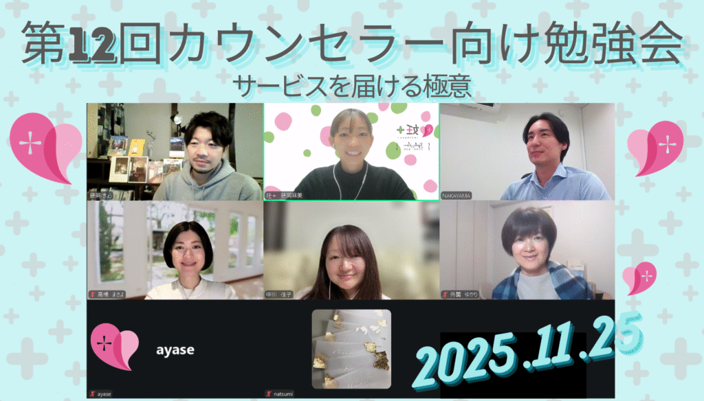 2025年11月25日、株式会社Jam 代表取締役 中山進介さんを講師にお招きし、nintarist向け勉強会を行いました。 テーマ:「サービスを届ける極意」講師:中山進介さん サービスを届けるために必要なスキル 「営業」「販売」「接客」のちがい 自分の強みと弱みを知るワーク などを学びました。 今後もnintarist同士の勉強会を定期的に開催し、みなさまに「安心して相談できる場所」を提供できるよう努めてまいります。 報告する コメント この記事へのコメントはありません。 コメントするためには、 ログイン してください。 関連記事一覧 2025年2月5日、カウンセリングのロープレを行いました! 2025年8月22日、nintarist交流会(第16回)を行いました 2025年7月28日、妊+のカウンセラーさん向け交流会(第15回)を行いました 2025年5月29日、妊+のカウンセラーさん向け勉強会(第7回)を行いました! 2025年8月28日、妊+のカウンセラーさん向け勉強会(第9回)を行いました! 2025年3月28日、妊+のカウンセラーさん向け交流会(第12回)を行いました 2025年4月28日、妊+のカウンセラーさん向け交流会(第13回)を行いました 妊+第8回カウンセラー交流会を行いました!