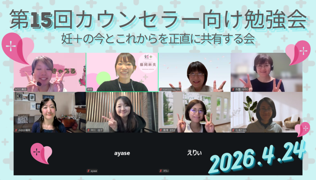 2026年4月24日、妊+創設者の藤岡麻美が講師を務め、nintarist向け勉強会を行いました。 テーマ:「妊+の今とこれからを正直に共有する会」講師:藤岡麻美(不妊カウンセラー) 妊+のこれまでの歩み 正直に困っていること 妊+が目指している未来 などを共有しました。 今後もnintarist同士の勉強会を定期的に開催し、みなさまに「安心して相談できる場所」を提供できるよう努めてまいります。 報告する コメント この記事へのコメントはありません。 コメントするためには、 ログイン してください。 関連記事一覧 2025年10月30日、nintarist向け勉強会(第11回)を行いました! 2025年7月20日、妊+のカウンセラーさん向け勉強会(第8回)を行いました! 2025年4月24日、妊+のカウンセラーさん向け勉強会(第6回)を行いました! 妊+第8回カウンセラー交流会を行いました! 2026年4月16日、nintarist交流会(第24回)を行いました 2025年12月17日 カウンセリングのロープレを行いました! 2025年12月28日、nintarist交流会(第20回)を行いました 妊+第4回カウンセラー交流会を行いました!